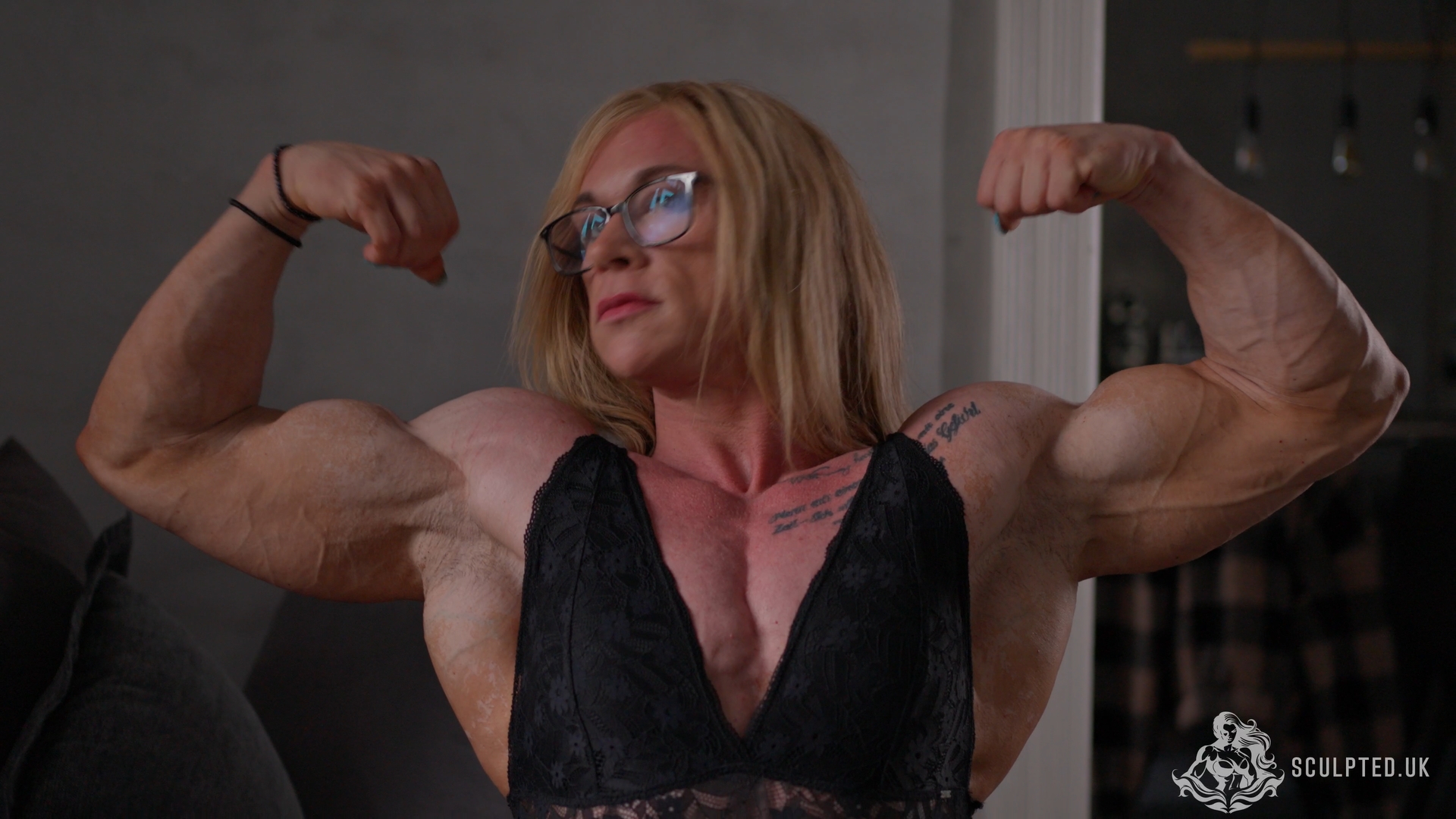 Just a week shy of contest shape, Jule amazes us with incredible striations, bicep peaks and hard curves! These Apartment videos feature her pumping and posing in mostly natural light in four delightful outfits! Jule’s first ever shoot with Sculpted should eb one to remember.